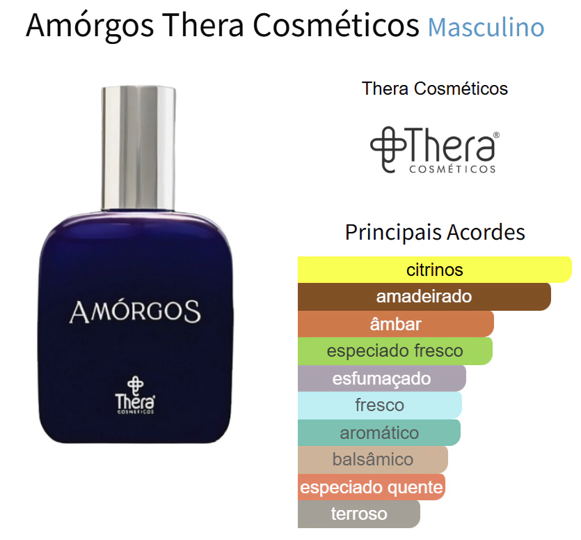 Amórgos de Thera Cosméticos é um perfume Amadeirado Aromático Masculino. Amórgos foi lançada em 2017. O perfumista que assina esta fragrância é Mário Torri Neto. As notas de topo são: Cítricos, Vetiver e Pimenta Rosa. As notas de coração são: Toranja, Cedro e Ládano. As notas de fundo são: Incenso, Gengibre e Sândalo.