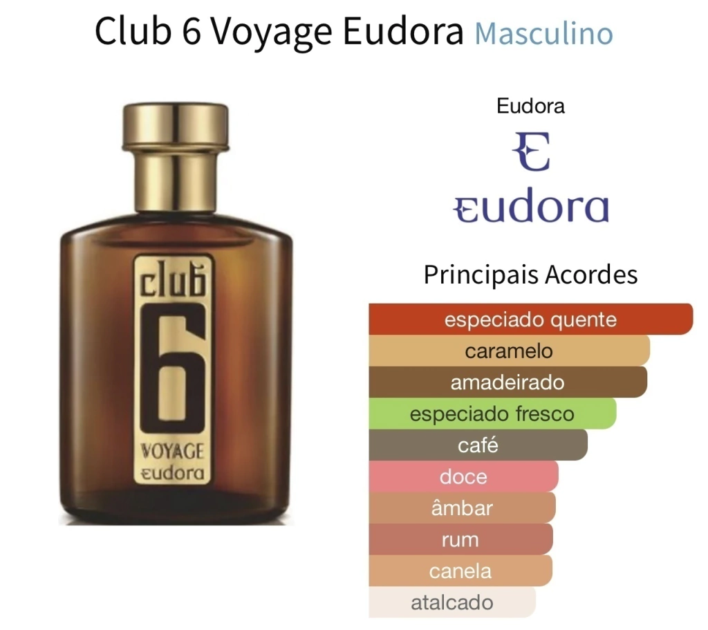 Club 6 Voyage de Eudora é um perfume Aromático Especiado Masculino. Club 6 Voyage foi lançada em 2020. As notas de topo são: Pimenta Preta, Noz-moscada, Mandarina e Bergamota. As notas de coração são: Café colombiano, Rum, Canela do Ceilão, Carvalho, Alecrim e Artemísia. As notas de fundo são: Caramelo, Âmbar, Almíscar, Patchouli, Sândalo e Cedro.