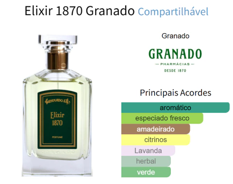 Elixir 1870 de Granado é um perfume Amadeirado Aromático Compartilhável. Elixir 1870 foi lançada em 2020. O perfumista que assina esta fragrância é Benjamin Belizon. As notas de topo são: Limão Siciliano, Manjericão e Laranja. As notas de coração são: Alecrim, Cardamomo e Murta. As notas de fundo são: Extrato de Lavanda, Pinheiro e Cedro.
