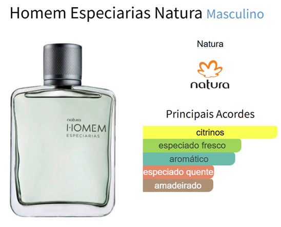 Homem Especiarias de Natura é um perfume Amadeirado Especiado Masculino. Homem Especiarias foi lançada em 2016. O perfumista que assina esta fragrância é Verônica Kato. As notas de topo são: Laranja, Limão, Bergamota, Mandarina, Toranja e Folhas de Ruibarbo. As notas de coração são: Pimenta Branca, Pimenta Preta, Gengibre, Noz-moscada, Coentro, Elemi e Gerânio. As notas de fundo são: Vetiver, Cedro, Patchouli, Almíscar e Benjoim.