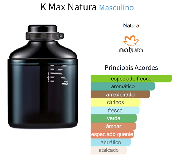K Max de Natura é um perfume Amadeirado Aromático Masculino. K Max foi lançada em 2019. K Max foi criado por Verônica Kato, Nicolas Beaulieu e Jean-Christophe Hérault. As notas de topo são: Hortelã, Pimenta Preta, Notas Aquosas, Cítricos, Gengibre, Pimenta Rosa, Toranja e Estoraque. As notas de coração são: Couro, Olíbano, Lavanda, Zimbro, Violeta e Cardamomo. As notas de fundo são: Xtreme Ambarino, Vetiver, Cedro, Patchouli, Almíscar, Breu-Branco, Cashmeran e Sândalo.