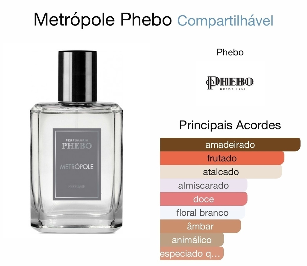 Metrópole de Phebo um perfume Amadeirado Floral Almiscarado Compartilhável. Metrópole foi lançada em 2019. As notas de topo são: Damasco, Figo e Bergamota. As notas de coração são: Sândalo, Jasmim e Lírio-do-Vale. As notas de fundo são: Almíscar, Âmbar e Cedro.